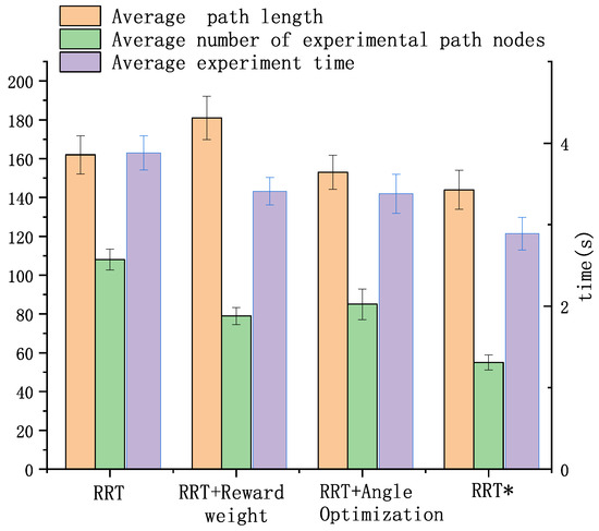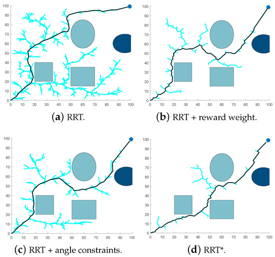 To test the local path planning ability of the UUV, we designed a multi-obstacle environment and compared the pre- and post-improvement RRT algorithms. We assumed that the simulation environment was a space of 100 m × 100 m; the detection radius of the UUV was 10 m; and the starting and ending coordinates were (0, 0) and (99, 99), respectively. The results are shown in Figure 12, where RRT* denotes the improved RRT algorithm obtained in Section 3.1. It is easy to see that the convergence of the spanning tree toward the goal point was greatly improved after the introduction of the gravitational component, and the path smoothness was guaranteed after the addition of the angle restriction. Figure 13 demonstrates the comparison of the above algorithms in terms of search speed and exploration degree. The exploration efficiency and success rate for finding the shortest collision-free path of the RRT* algorithm proposed in this paper were greatly improved in the multi-obstacle environment.