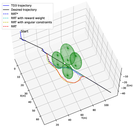 As shown in Figure 17 and Figure 18, in the continuous obstacle environment, the four RRT-based algorithms realized the switching of task states and completed the planning of local collision-free paths through the event triggering mechanism. Due to some randomness in the RRT algorithm, when the reward component was not added, the local path was generated away from the desired direction at a distance larger than half of the sphere. However, after the addition of the reward component, the local path was generated closer to the desired trajectory and the target point. Meanwhile, the smoothness of the planned paths was improved after angle optimization was implemented. Figure 19 and Figure 20 show the joint experiment in a complex-obstacle environment, where the local planning task was turned on after the UUV detected an obstacle (). The four algorithms under the RRT framework planned different collision-free paths before became 0. It is easy to see in the side view of Figure 19 that the paths planned by the basic RRT and RRT with angular constraints algorithms were relatively long and did not find narrow passages between obstacles. Conversely, after adding the reward component, as shown in the top view of Figure 20, the generation of the localized path moved towards the desired trajectory and successfully searched for the narrow passage. The effectiveness of the proposed algorithm was confirmed.