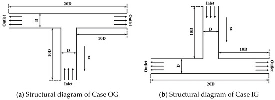 Figure 1 shows the arrangement of tee pipes in two directions of gravity. The direction of gravity in Figure 1a is opposite to the inlet velocity, while that in Figure 1b is identical to the inlet velocity. Both tee pipes are symmetrical and contain two outlets. To facilitate the analysis, all calculation cases for the tee pipes in this study are named with the direction of gravity (i.e., OG and IG represent the inlet velocity opposite to gravity and identical to gravity, respectively), the particle concentration (i.e., 0.5C to 7C, respectively, represent particle concentration = 0.5% to 7%), the inlet velocity (i.e., 3V to 6V, respectively, represent inlet velocity = 3 m/s to 6 m/s), and the particle diameter (i.e., 0.6D to 1.5D, respectively, represent particle diameter = 0.6 mm to 1.5 mm). Thus, Case OG-3V-0.5C-1D represents the numerical calculation of the tee pipe with the inlet velocity of 3 m/s, the particle concentration of 0.5%, and the particle diameter of 1 mm under the flow condition that the inlet velocity direction is opposite to the gravity.