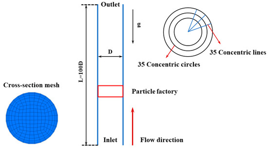 Alajbegovic et al. measured the particle volume fraction, fluid and particle velocity, and turbulent pulsation velocity with a delivery diameter of 2.32 mm and a concentration of 2.33% in a vertical pipe. This paper establishes a vertical pipe model consistent with the experiment, whose diameter is 30.6 mm, and the ratio of pipe length to diameter is 100, as shown in Figure 2. In addition, a particle factory was established 100 mm from the pipe inlet, and the particle concentration was defined by setting the number of particles produced in the particle factory.