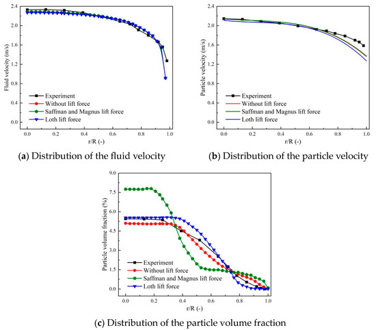 The numerical simulation results are obtained on a section 2200 mm away from the inlet. By making a series of concentric circles on the section and averaging the parameters, the correlation curves between different parameters and r/R are obtained. Figure 3 compares the simulated and experimental results for particle volume fraction and particle and fluid velocities. The results indicate that the fully coupled CFD-DEM numerical model established in this paper can accurately predict the flowing process and particle distribution in vertical pipes.