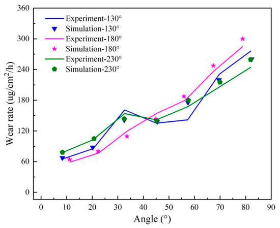 The comparison between the calculated erosion rate of the 90° elbow and the experimental results is shown in Figure 5. The corresponding azimuth angles of the outermost side and the symmetrical parts on the two outermost sides are defined as 180°, 130°, and 230°, respectively. As can be seen from the figure, the general trends of the simulation and experiment results are close, and the erosion rate at the elbow outlet is the largest, illustrating the correctness of the E/CRC erosion model adopted in this research.