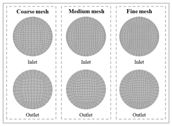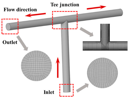 The computational domain of the tee pipe is divided by a structured grid. In this paper, the two-way coupling calculation approach is used, the particle volume fraction needs to be calculated, and the grid size is required to be 2–3 times the particle size. Considering the destructive effect of particles on the boundary layer and the calculation accuracy of the particle volume fraction at the boundary layer, the thickness of the first grid layer is 0.5 mm, and the value of Y+ is around 120.