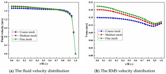 The Monte Carlo approach is adopted in this research to calculate the volume fraction of the particles, which requires the minimum volume of mesh to be 10 times the volume of the particle. For the fine mesh, during the CFD-DEM two-way coupling calculation process, it is easy to cause divergence in the numerical simulation. Therefore, the irrelevant research on the mesh is mainly reflected in the recognition of the mesh on the clear water flow field, as shown in Figure 7 and Table 3. The maximum relative error between the coarse mesh and the medium mesh is 4.2%, and the maximum relative error between the fine mesh and the medium mesh is 0.6%, as shown in Figure 8. Based on the above results, medium mesh is calculated in the following numerical simulation process.