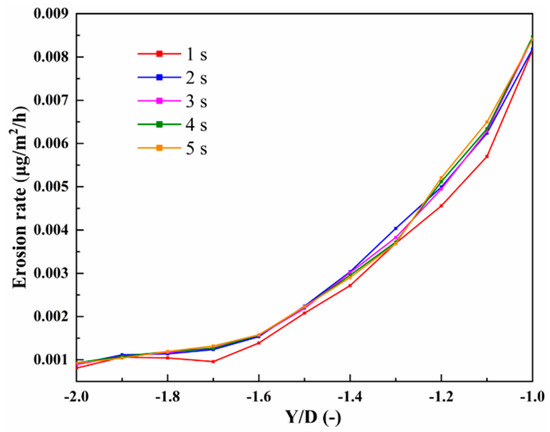 The main research content of this article is the erosion distribution caused by particles on the wall surface under the conditions of liquid–solid multiphase flow. Considering the insufficiency of the interaction between particles and fluid at the beginning, and the randomness of the particle position generated by the particle factory, there is a time statistics error on the wall erosion. Therefore, under the flow conditions of a particle diameter of 1 mm and a particle volume concentration of 0.5%, an irrelevant verification of calculating duration was performed. The erosion rate was average, and the erosion rate of the partial left branch pipe is shown in Figure 9. The results indicate that the simulation time has little influence on the prediction of the erosion distribution. Considering the calculation accuracy and computing resources, the calculation duration is 2 s.