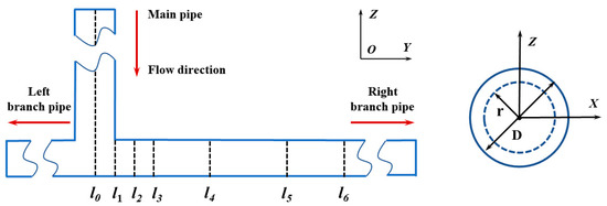 The research object of this paper consists of a standard tee junction and straight inlet and outlet pipes with a diameter of 30 mm. In order to obtain a stable two-phase velocity field before the liquid–solid mixture enters the tee junction, a vertical pipe with a length of 10D is set before the entrance of the tee junction. In order to eliminate the influence of the secondary flow in the tee pipe and obtain a stable pressure outlet, the length of the horizontal pipe at the outlet of the tee junction is also set to 10D. A cylindrical particle factory with a diameter of D and a length of 2D is built at the inlet of the vertical pipe, and the required particle concentration is simulated by setting the number of particles produced per second. The schematic geometric model is shown in Figure 6.