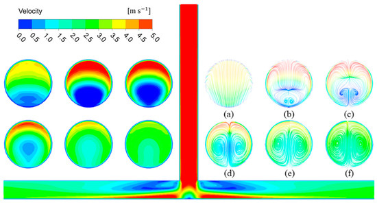 Although the geometric structure of the tee pipe is simple, the flowing process inside the tee pipe is complex and the velocity distribution changes drastically. For better analysis of the generation and development of vortices in the tee pipe, the contours of liquid velocity and the streamlines of liquid in six cross-sections downstream of the tee junction based on Case IG-0.5C-1D-5V were acquired, as shown in Figure 11.