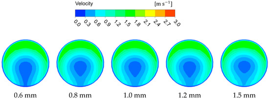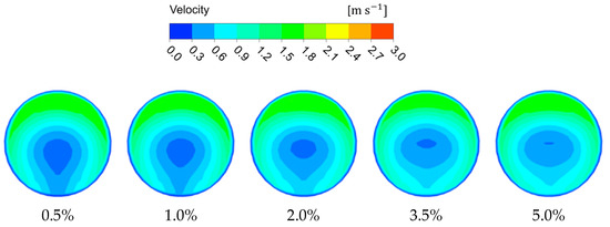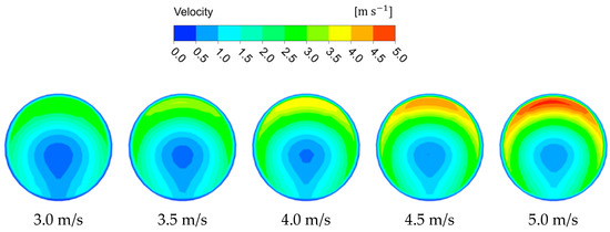 For better understanding of the velocity distribution in the tee pipe under different working conditions, a cross-sectional velocity comparison of l4 under different inlet velocities, concentrations, and particle diameters was carried out. As can be seen from Figure 12, Figure 13 and Figure 14 the velocity contour distribution changes greatly under different flow conditions and, as the inlet velocity increases, the low-velocity region in the horizontal pipe becomes smaller and moves toward the center, while the high-velocity region becomes larger and diffuses circumferentially along the pipe wall. However, when the particle concentration increases, the high-velocity region does not change significantly, and the low-velocity region becomes wider and moves toward the pipe center. In addition, variations in particle size have little influence on the velocity distribution. This illustrates that the fluid velocity and particle concentration have a greater effect on the tee pipe transportation process.