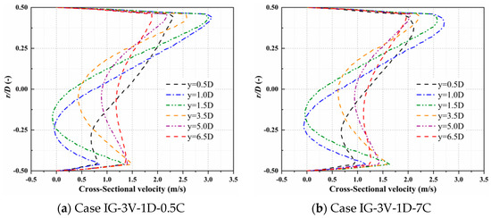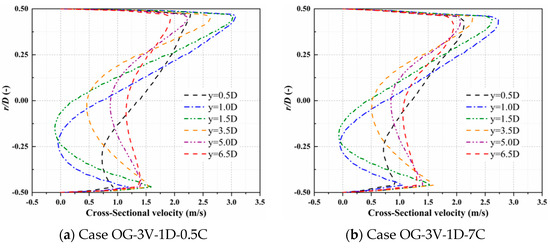 Comparison of cross-sectional velocity profiles between Case 0.5C-1D and Case 3V-0.5C.