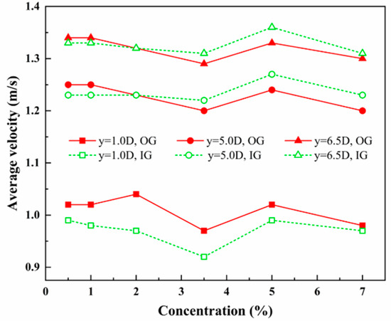 The average velocity comparison of tee pipes has been made in Figure 19 with particle concentration increasing from 0.5% to 7% to analyze the influence of the two gravity directions on the flowing process when the fluid passes through the tee junction. It demonstrates the tendency of how the average cross-sectional velocities at different positions of the horizontal branch pipe (i.e., y = 1.0D, 5.0D, and 6.5D) change with the increase in particle concentration in the two gravity directions. It can be seen from the comparison that the variation tendency of the average velocity at different cross-sections downstream of the tee junction opposite to the gravity direction is consistent with that of the pipe identical to the gravity direction. It indicates that, for different gravity directions, the mainstream characteristics of the horizontal branch pipe downstream of the tee junction remain the same. Based on the particulars of profiles, the velocities at y = 1.0D in the OG direction cases are larger than that of the corresponding cases in the IG direction. The average cross-sectional velocity divergences between the two gravity directions become not obvious at y = 5.0D and y = 6.5D. It illustrates that the effect of the gravity direction mainly influences the flowing process close to the tee junction, which is progressively decreased and disappears along the horizontal branch pipe downstream of the tee junction.