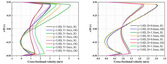 Comparison of cross-sectional velocity profiles between Case IG-3V-1D and Case OG-3V-1D.