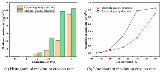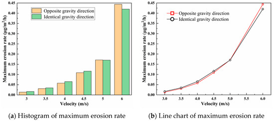 As shown in Figure 21, when the conveying velocity increases, the maximum erosion rate of the pipeline increases and shows exponential growth. Since the kinetic energy of particle collision has a quadratic relationship with the velocity, the change in fluid velocity has a considerable impact on erosion. A higher inlet velocity will make the solid particles obtain greater collision energy, and the cutting effect generated by hitting the pipe wall will be stronger, leading to an increase in the erosion rate. Comparing the two curves in Figure 21b, it can be found that when the inlet velocity is lower than 5 m/s, the growth rate of the maximum erosion rate of Case IG-0.5C-1D is slightly greater than that of Case OG-0.5C-1D, which is due to the impact of gravity. The kinetic energy of the particles in the pipeline in the IG direction is slightly greater than that in the OG direction, and the pipeline erosion is slightly stronger. When the inlet velocity is higher than 5 m/s, the erosion growth rate in Case OG-0.5C-1D exceeds that in Case IG-0.5C-1D, because as the velocity increases, some particles cannot follow the mainstream in time and are attached to the wall by gravity, which blocks the impact of particles in the subsequent incoming flow and slows down the erosion process.