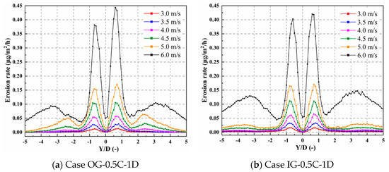 When the direction of gravity is opposite to the inlet velocity, the erosion from the middle position of the horizontal pipeline to the outlet on both branch pipes presents two peaks and one trough, as shown in Figure 22a. The position of y = 0.75D is the main erosion peak, and the erosion rate of the pipe inner wall reaches the maximum value, while the position of y = 1.5D is the erosion trough, and the erosion rate is relatively small. When the velocity is lower than 5 m/s, the secondary erosion peak appears at the position y = 2.5D. However, the secondary erosion peak shifts to the position y = 3.5D when the velocity increases to 6 m/s. The erosion rate gradually decreases along the outlet direction outside the secondary erosion peak. The main erosion peak is caused by the direct collision of the particles carried by the mainstream fluid in the vertical pipe on the facing wall, and the secondary erosion peak is caused by the secondary flow and backflow formed in the branch pipe through the tee junction. When the gravity direction is the same as that of the inlet velocity, the variation tendency of the erosion rate in the main erosion region is close to Case OG-0.5C-1D as the inlet velocity increases from 3 m/s to 5 m/s, while the secondary erosion peak is not obvious, and the change in erosion rate on both sides of the branch pipes tends to be stable. This indicates that under the condition of low inlet velocity, the erosion of the pipeline in the IG direction is less affected by the secondary flow. However, when the velocity reaches 6 m/s, the erosion rate in the secondary erosion peak region changes significantly, widens, and shifts to the outlets on both sides of the branch pipes. At the position y = 5D, the erosion rate of the pipeline increases significantly, indicating that the erosion downstream is more severe. It can be seen that with the increase in the conveying velocity, the impact of the secondary flow and backflow in the pipeline on the erosion is significant.