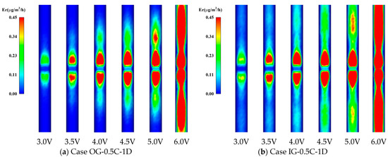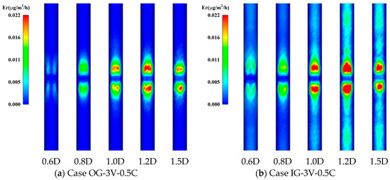 Figure 23a and Figure 23b, respectively, show the erosion contours of Case OG-0.5C-1D and Case IG-0.5C-1D. It can be seen from Figure 23 that two erosion regions appear in pairs at the branch pipes under the velocities of 3 m/s and 3.5 m/s, which correspond to the main erosion peaks. When the velocity increases to 4 m/s, the secondary erosion regions start to appear on both sides of the main erosion region. As the velocity increases to 6 m/s, the erosion regions gradually become larger and wider. The erosion strength under the condition of Case IG-0.5C-1D seems to be more severe and there is a continuous erosion region from the branch pipe center to the outlet, while there is a discontinuous erosion region outside the main erosion region under the condition of Case OG-0.5C-1D.