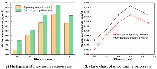 When the particle diameter increases from 0.6 mm to 1.5 mm, the maximum erosion of the pipeline first increases and then decreases, as shown in Figure 24. With the particle diameter increasing, the mass of a single particle increases, thereby increasing the kinetic energy, and the erosion caused by the particle hitting the wall is strengthened. Since the particle Stokes number represents the ratio of the particle response time to the flow field change and the fluid characteristic time, when the particle diameter increases, the inertial force correspondingly increases, and the time for the particles to respond to changes in the flow field increases. At this time, the particles are less affected by the fluid flow, the flowability of the particles becomes worse, thus the erosion on the pipe inner wall is weakened.
