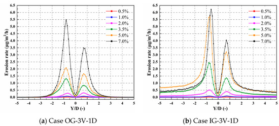 When the direction of gravity is opposite to the inlet velocity, the erosion area is mainly concentrated at the position y = 0.75D, while the erosion rate is relatively small and negligible outside the position y = 3D. This is because the particles fall back to the mainstream after colliding with the wall under the action of gravity, so the impact frequency on the walls of the branch pipes on both sides is relatively small, and the erosion is weak. When the gravity direction is the same as the inlet velocity, the erosion rate of the pipeline increases significantly under the same particle volume concentration. When the particle volume concentration reaches 7.0%, the erosion growth rate is significantly reduced, and the erosion rate of some pipelines is less than that under the condition of 5% concentration. The erosion rate on both sides of branch pipes is much greater than that in Case OG-3V-1D, which is because the movement direction of the particles is the same as the gravity direction, the kinetic energy is relatively high, the cutting action of the particles hitting the pipe wall is enhanced, thus the erosion is increased. Furthermore, when the concentration is high, the collision between the particles becomes more intense, resulting in partial energy loss, causing the collision velocity with the pipe wall to decrease, thereby the erosion rate decreases. Affected by gravity, some particles accumulate and adhere to the facing wall surface, preventing further erosion and wear of the wall surface caused by particles in the subsequent incoming flow, that is why the erosion growth rate of the main erosion peak slows down. At the same time, the particles accumulated on the wall surface are squeezed and pushed by the fluid and particles, slide and collide with the wall surface, and translate to the outlet, showing a long wear belt on both branch pipes.