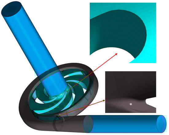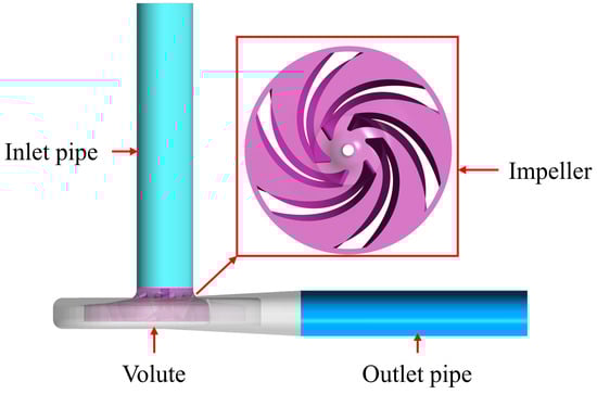 The focus of the research is a marine sediment pump. The design flow rate Qd is 160 m3/h (0.04444 m3/s), the design head Hd is 44 m, the rotational speed n is 1480 r/min, and the efficiency ηd is 68%. Therefore, the specific speed is about 67. The basic parameters of the marine sediment pump are depicted in Table 1, and the three-dimensional fluid domain is depicted in Figure 1.