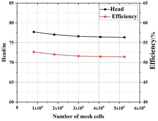 The overall mesh division of the calculation domain of the marine sediment pump is given in Figure 2. The four calculation domains are divided by hexahedral mesh cells, and the mesh near the key walls is refined. The overall mesh cell quality remains above 0.3, maintaining a mesh minimum corner angle exceeding 18°, while the y+ values along the wall remain below 20, which can fulfill the near-wall mesh configuration of the SST k-ω turbulence model []. Under the design conditions, the same boundary conditions are used to simulate the computational domain with five different mesh number schemes, and the head and efficiency are recorded. The specific data of the mesh-independent analysis of the marine sediment pump are shown in Table 2 and Figure 3. In the case where the number of mesh cells exceeds 3,003,478, the efficiency and head fluctuation range are both less than 0.5%. Therefore, to save computing resources and improve computing speed, the 3,003,478 meshes are selected for subsequent research.