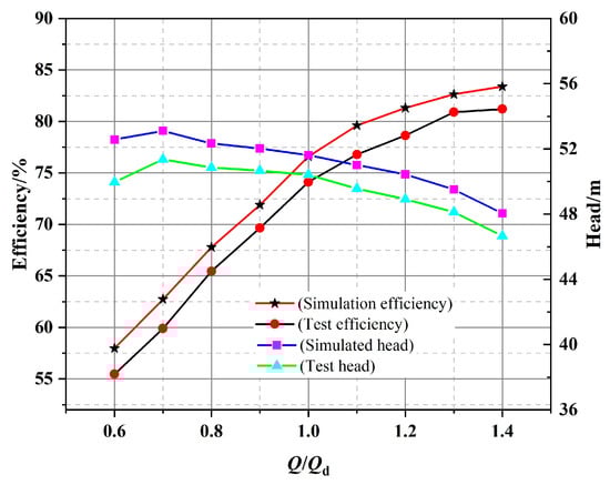 The comparison of the external characteristics between the test and the simulation results is presented in Figure 4, and the marine sediment pump test bench is presented in Figure 5. As indicated in Figure 4, there is a strong agreement between the simulation and test results. The efficiency difference at the design flow rate is 2.48%, accompanied by a relative error of 3.35%. The head difference is 1.2 m, and the relative error is 2.38%. These errors are all within the reasonable range, which verifies the exactness of the numerical simulation.