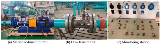 To further verify the accuracy of the numerical calculation results, this study conducted an experimental study on the original model of the marine sediment pump. Furthermore, this study also analyzed the uncertainty index of each measurement parameter and the overall accuracy of the test bench []. In the test, pressure sensors were used to monitor the inlet and outlet pressures. The measurement deviation of the inlet and outlet pressure sensors are both ±0.5%. In addition, the measurement deviation of the turbine flowmeter is ±0.5%, the measurement deviation of the torque sensor is ±0.5% and the speed sensor measurement deviation is ±1.0%.
