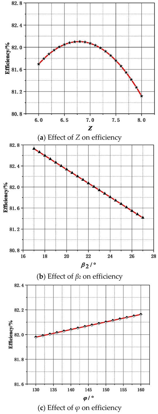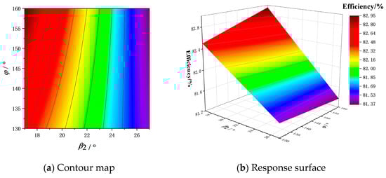As shown in Figure 8, when β2 remains constant, there is a positive correlation between φ and efficiency. Conversely, when φ is constant, β2 is negatively correlated with efficiency in the range of 17°–27°. By analyzing the two-factor interaction diagram, both Z and β2 exert a more pronounced influence on efficiency, while the effect of φ on efficiency is relatively insignificant. When Z and β2 are within a specific range, the efficiency has an extreme value, which aligns with the findings presented in Table 6.
