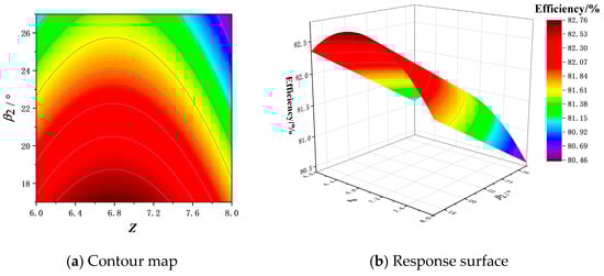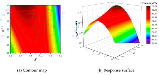 Figure 7, Figure 8 and Figure 9 depict the correlation between the efficiency η of the response variable and the three design variables. Figure 6a is the contour map and Figure 6b is a response surface map. As shown in Figure 6, when Z is constant, β2 is negatively correlated with the efficiency. When β2 is constant, the efficiency initially rises and subsequently decreases as Z increases. As depicted in Figure 7, when Z is less than 7, φ is positively correlated with efficiency, and when Z is larger than 7, φ is negatively correlated with efficiency. While maintaining a constant value for φ, the efficiency exhibits an upward trend followed by a downturn as the Z increases.