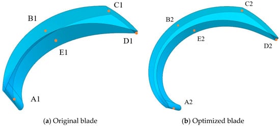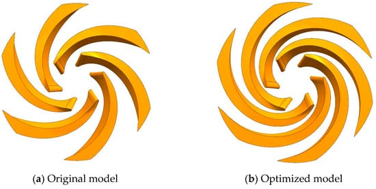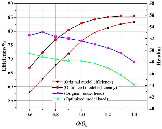 Figure 11 illustrates the contrasting impeller blade structures between the original model and the optimized model, while Figure 12 showcases the external characteristic curves. The efficiency of the optimized model has been significantly enhanced, and the head is reduced while still meeting the design conditions. The efficiency of the optimized model is elevated by 6.33% under the design condition, a 2% increase in efficiency under the overload flow conditions, and increased by more than 8% under the partial load flow conditions.