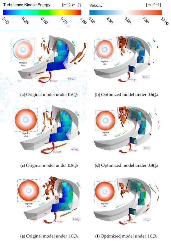 Turbulent kinetic energy and vortex distribution of the impeller across various flow conditions.