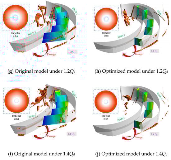 Figure 15 illustrates variations in impeller inlet velocity and distribution of vortex and turbulent kinetic energy (TKE) across a single impeller flow channel at five various flow conditions (Q/Qd = 0.6, 0.8, 1.0, 1.2, and 1.4). The sections are categorized as (1) through (5) in sequence from the impeller flow channel’s inlet to its outlet. This arrangement facilitates the explanation of variations in the TKE distribution across the impeller flow channels. Under varying flow conditions, the highest TKE is generated within section (1). As the flow rate increases, the TKE on the pressure surface of the blade gradually diminishes, while the TKE on the blade suction surface gradually increases. Figure 15 illustrates that the velocity distribution at the impeller inlet remains nearly identical between the original model and the optimized model. The distribution of TKE in the impeller flow channel of the original model is extremely uneven under five flow conditions, while the optimized model only has an uneven TKE distribution under partial load flow conditions. Under both the design and overload flow conditions, the TKE distribution within the optimized model’s flow channel becomes more uniform, and a substantial reduction in large-area vortices is observed. This signifies a notable enhancement in the outlet velocity of the optimized model, leading to a more even distribution of flow velocities.