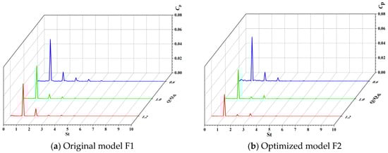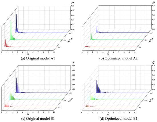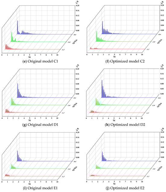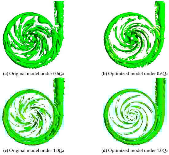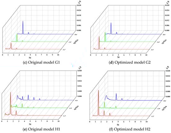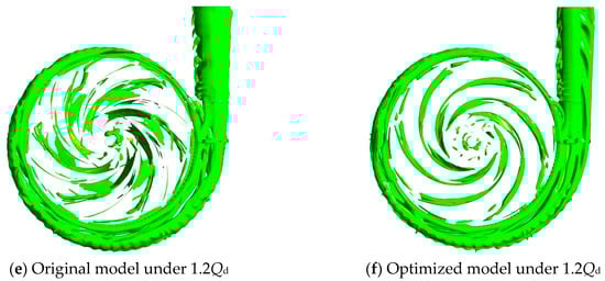 Figure 18 depicts the distribution characteristics of the three types of entropy production under different flow conditions (Q/Qd = 0.6, 0.8, 1.0, 1.2, and 1.4). Both the wall entropy production () and the direct entropy production () of both the original model and the optimized model exhibited an initial increase followed by a decrease with the escalation in the flow rate. In contrast, the turbulent entropy production () has consistently decreased with the rise in flow rate. Comparing the three types of entropy production values of the optimized and original models, it becomes evident that across diverse flow conditions, the wall entropy production, the turbulent entropy production () and the direct entropy production () of the optimized model have been decreased. Among them, the wall entropy production () ratio and the turbulent entropy production ratio are larger, while the direct entropy production () ratio does not exceed 1%. Furthermore, the data from both the optimized model and the original model reveal a notable increase in the wall entropy production () ratio as the flow rate rises, while the direct entropy production () ratio experiences a slight increment. But the turbulent entropy production () ratio decreased significantly.
