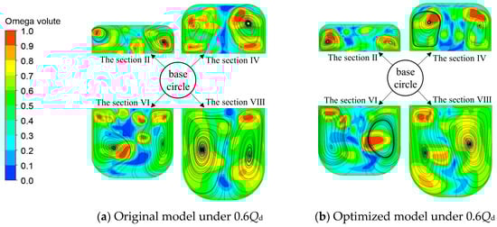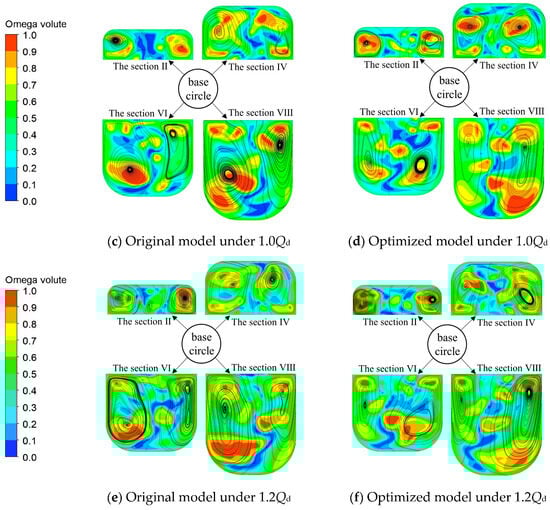 Figure 17 illustrates the distribution of Omega vortices and streamlines at sections II, IV, VI, and VIII in the volute under various flow conditions (Q/Qd = 0.6, 1.0 and 1.2). And the sections II, IV, VI, and VIII are shown in Figure 14. The actual operation of the pump is influenced by various factors such as wall conditions and flow rates, and the regions with higher Omega values align more closely with the vortex distribution. The distribution of high-Omega-value areas of the original model appears to be relatively scattered under partial load flow conditions, with numerous vortices observed in section II. In contrast, the high-Omega-value area of the optimized model is more concentrated, and the streamlined distribution is more regular, primarily concentrated on both sides of the volute section. Under overload flow conditions, the optimized model also experiences a reduction in the high-Omega-value area, and the effect is remarkable in the VI and VIII sections. Under the design conditions, the distribution of the high-Omega-value area is more regular compared to the partial load flow conditions. In each section, the optimized model exhibits a reduction in the high-Omega-value area, with the most significant effect observed in section VIII, which indicates a significant improvement in the fluid flow characteristics of the optimized model.