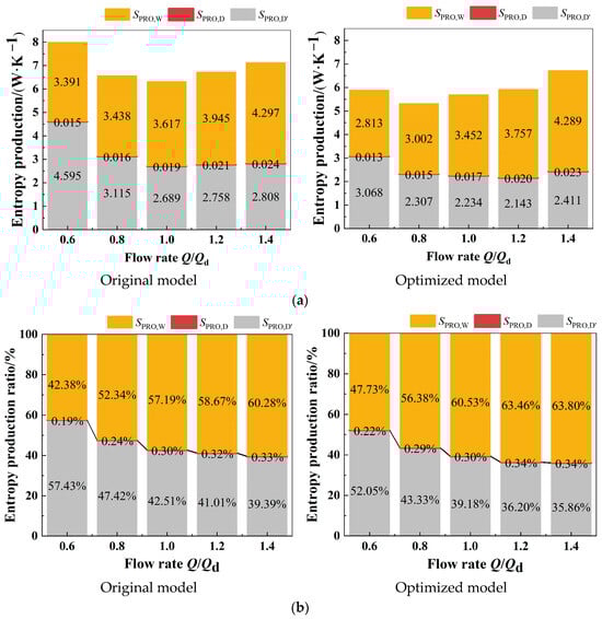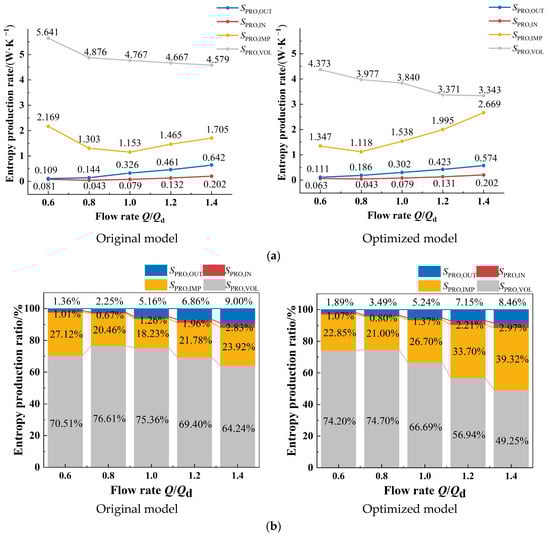 Distribution characteristics of different flow components of entropy production and entropy production ratio. (a) Distribution of entropy production under different flow conditions. (b) Distribution of entropy production ratio under different flow conditions.