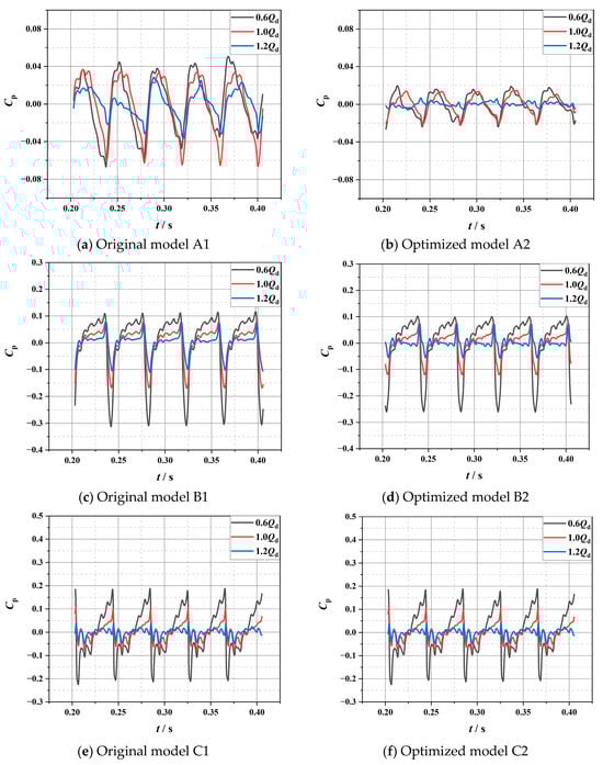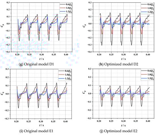 Figure 20 shows the noticeable periodicity of pressure fluctuations at monitoring points on the blade pressure surface and the suction surface under different flow conditions. Notably, all monitoring points exhibit five distinct peaks and troughs. The pressure fluctuation within the pump intensifies progressively from the leading edge to the trailing edge, and the pressure fluctuation at the pressure surface is greater than at the suction surface. Under partial load flow conditions, the pressure fluctuation becomes most pronounced, and its amplitude gradually diminishes with escalating flow rates. This phenomenon can be attributed to the shedding of eddy currents occurring under partial load flow conditions. In comparison to the original model, the optimized model has made improvements in the pressure fluctuations at four monitoring points: A2, B2, C2, and E2. These improvements are particularly noticeable under partial load flow conditions and design conditions. The optimization has improved the unsteady flow within the impeller flow field. Compared with other monitoring points, the pressure fluctuation at monitoring point A1 is more disordered and irregular. Due to the fluid colliding with the blade leading edge when it enters the impeller, backflow and unstable fluctuations are formed. Meanwhile, compared with monitoring point D1 on the trailing edge of the blade, it becomes evident that monitoring point D2 exhibits heightened pressure fluctuations under partial load flow conditions, which may be due to the velocity inconsistency between the impeller and volute of the optimized model, and a small eddy current area is created.