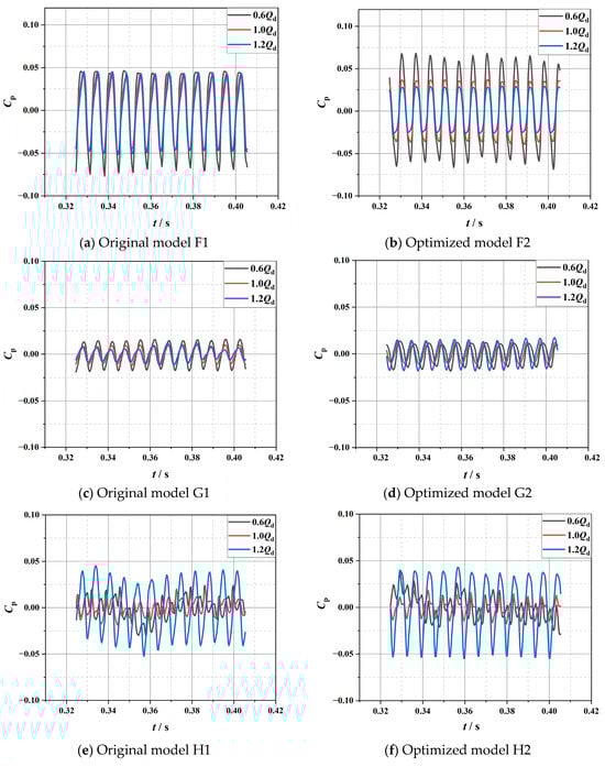 In Figure 22, both monitoring points F1 and F2 observed the same phenomenon of six peaks and troughs. This observation indicates that the primary source of pressure pulsation is the dynamic and static interaction between the impeller and the volute. It is worth noting that the optimized model reveals that the issue of pressure pulsation is particularly severe under partial load flow conditions. However, under design conditions and overloaded flow conditions, the condition of pressure pulsation is significantly decreased. The pressure pulsations at monitoring point G1 and G2 in section VI of the volute are significantly smaller than in section II of the volute. This observation highlights the complex flow generated in the vicinity of the tongue area. Additionally, both the amplitude and instability of the pressure pulsations significantly decrease as the monitoring points move away from the tongue area. Furthermore, under partial load flow conditions, the pressure pulsations observed at monitoring points H1 and H2, situated in the vicinity of the tongue area, exhibit periodic weakening compared to the other monitoring points. This phenomenon can be attributed to the formation of backflow vortices near the tongue. However, as the flow rate increases, the periodic nature of these pressure pulsations becomes more pronounced. A significant fluctuation in pressure pulsation is observed in the optimized and original model under overload flow conditions. This phenomenon can be attributed to the intensified impact on the tongue as the fluid velocity in the volute escalates with higher flow rates, ultimately leading to severe pressure pulsations.