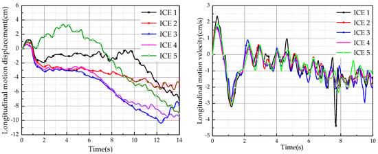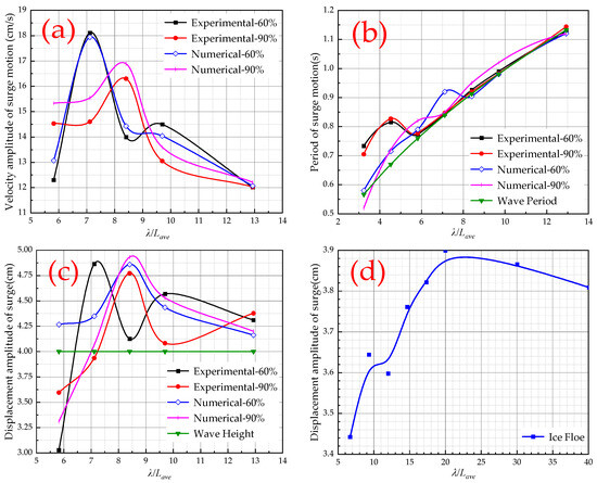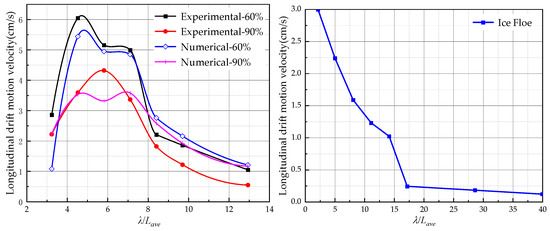 - In the long-wave range, the ice floes exhibit regular motion. As the wavelength increases, the mean velocity of the longitudinal drift motion of the ice floes decreases and eventually approaches zero. Conversely, the speed and displacement amplitude of the longitudinal surge motion of the ice floes increase rapidly, surpassing the wave height, and subsequently decrease to approach the wave height as the wavelength increases. Additionally, the response period of the longitudinal surge of the ice floes coincides with the wave period.