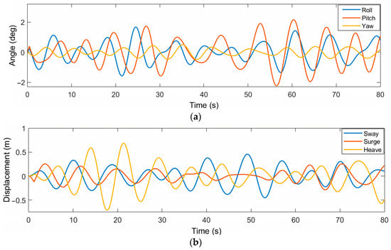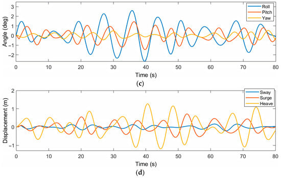 From Figure 3a,b, the maximum amplitude of roll is about 2.2 degrees, and the amplitude is constantly changing. The maximum angles of pitch and yaw are 2 and 0.7 degrees, respectively. The maximum displacement of sway and surge is 0.4 m, and the maximum displacement of heave is 0.7 m.