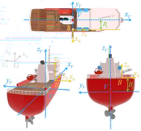 The setting of the coordinate system is shown in Figure 4. Point G is the center of the geodetic coordinate system, point V is the center of the ship’s coordinate system, and point B is the geometric center of the base bottom of the TAS. In this study, G and V were set to coincide. In addition, V is the intersection of the ship’s roll axis, pitch axis, and yaw axis. The installation position of the TAS is on the starboard side of the ship, parallel to and directly above the pitch axis, . The distance between B and V on the axis is . The distance between B and V on the axis is .