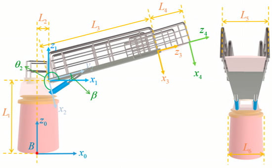 The coordinate system for the TAS is established in Figure 5. Coordinate system {0} is positioned at the geometric midpoint of the base bottom, while coordinate system {1} is located at the intersection of the rotary and pitch joints. Additionally, coordinate system {2} is established on the pitch arm. While the Y-axis shifts in tandem with the pitch arm movement, the coordinate origin remains identical to {1}. The coordinate system {3} is established at the intersection of the pitch and telescopic arms, and the z-axis points in the telescopic direction. The coordinate system {4} is established at the end of the telescopic arm, namely the end effector of the TAS. According to the D-H parameters, the four parameters between the two joints can be determined: connecting rod length, , torsion angle, , connecting rod offset, , and joint angle, , as shown in Table 3.