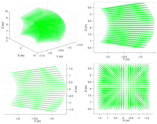 It is easy to see that the TAS in this study has a wide workspace and the outermost side of the workspace is curved. The workspace ranges −1.65 m~1.65 m on the x-axis, −13.38 m~−11.77 m on the y-axis, and 6.49 m~9.79 m on the z-axis. The maximum distance of the TAS in the workspace on the x-axis is greater than its telescopic length, , which is due to the curved surface formed at the edge of the workspace at the end of the TAS, and the distance between the edges of the two curved surfaces is greater than the width of the inner side, as can be seen from the first image in Figure 6.