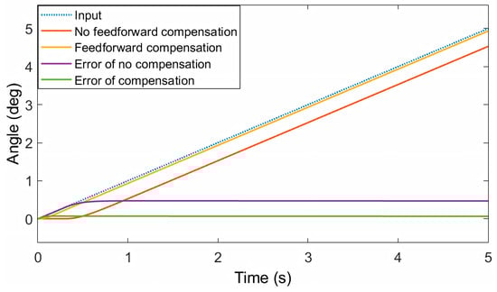 The compensation unit transfer function of the rotary joint system was obtained according to the above method and the results were compared with the system without feedforward compensation, as shown in Figure 16. The input signal is . The error can reach 0.45° without compensation, and after feedforward compensation, the error is less than 0.1°. It is apparent that feedforward compensation accelerates the response speed of the system and greatly reduces system error.
