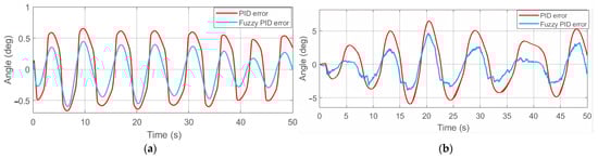 Angle error comparison: (a) angle error of the rotary joint hydraulic cylinder and (b) angle error of the pitch joint hydraulic cylinder.