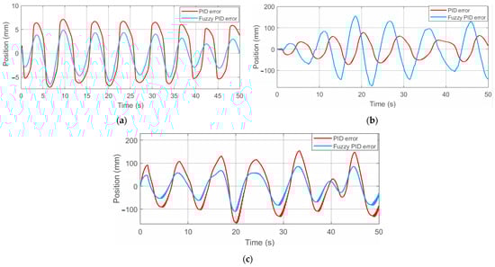 Figure 18 shows a comparison of the position error of the hydraulic cylinder of the ordinary PID and fuzzy PID algorithms. For rotary joint control, the position error of ordinary PID control was controlled within 7 mm, while fuzzy PID control can reduce the error to (−6.4 mm, 4.8 mm). The error of the fuzzy PID was greater than the error of the PID in a short period of time. For pitch joint control, the error was controlled within 160 mm by ordinary PID, while for fuzzy PID, the error was reduced to 80 mm. In the control of the telescopic joint, the error displacement of ordinary PID control was within 150 mm, while fuzzy PID control can reduce the error to (−100 mm, 80 mm). It is worth noting that Figure 17a and Figure 18a are very similar, because the rotary joint uses a symmetrical hydraulic cylinder as the execution unit, and hydraulic valves, angle sensors, power amplifiers, etc., can be considered as proportional components.