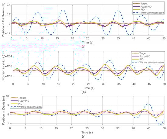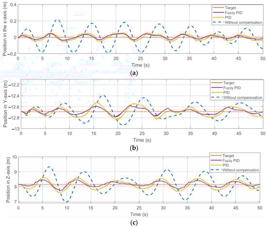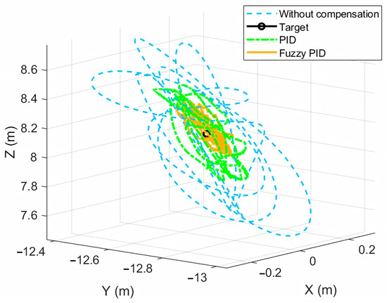 The position of the TAS end effector at the X-axis, Y-axis, and Z-axis after 50 s of simulation is shown in Figure 19. Before compensation, the maximum position error in the X direction can reach 0.2396 m, the maximum position error in the Y direction can reach 0.2032 m, and the maximum position error in the Z direction can reach 1.2907 m. However, it is obvious that the position error was greatly reduced whether using PID control or fuzzy PID control. For the former, the maximum error of displacement in the X direction was reduced to 0.0526 m, that in the Y direction was reduced to 0.1256 m, and that in the Z direction was reduced to 0.4805 m. For the latter, the maximum error of displacement in the X direction was reduced to 0.0441 m, that in the Y direction was reduced to 0.0967 m, and that in the Z direction was reduced to 0.3492 m.
