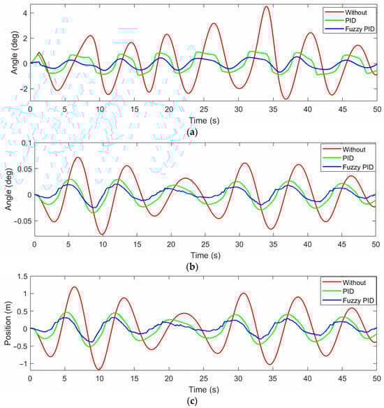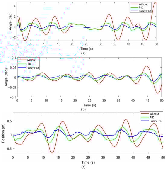 When the encounter angle becomes 90, the situation becomes different. The roll, pitch, and heave heights of the TAS at this time are shown in Figure 22. For the roll angle, the size did not increase but decreased instead. The roll angle of the TAS before compensation was (−2.84, 4.45), and the difference between the highest and lowest amplitudes was 7.29, which is 2.8% less than the obtained 7.5° when the encounter angle was 45 degrees. After PID compensation, the amplitude of the roll angle decreased to (−0.923, 0.892), with a decrease of 75.1%. After fuzzy PID compensation, the amplitude of the roll angle was reduced to (−0.684, 0.452), with a decrease of 84.4%. The decrease in amplitude was not significant compared to when the encounter angle was 45 degrees. For the pitch angle, the amplitude range of the pitch angle before compensation was (−0.075, 0.071), and the difference between the highest and lowest amplitudes was 0.136°, which is an 7.4% increase compared to the obtained 0.136° when the encounter angle was 45 degrees. After PID compensation, the amplitude of the pitch angle decreased to (−0.035, 0.029). After fuzzy PID compensation, the amplitude of the pitch angle was reduced to (−0.024, 0.019). For the heave height, the range of heave height before compensation was 1.170 m, and the difference between the highest and lowest heave heights was 2.340 m, which is an increase of 89.4% compared to the obtained 1.214 m at an encounter angle of 45 degrees. After PID compensation, the heave height was reduced to (−0.516 m, 0.468 m). After fuzzy PID compensation, the heave height was reduced to (−0.37 m, 0.314 m). Overall, compared to an encounter angle of 45 degrees, the roll angle decreased, while the pitch angle and heave height increased. The reason for this is the same as in Figure 3. The change in the encounter angle to 90 degrees increased the roll angle and heave height of the ship, while the pitch angle decreased. However, in this case, the coordinate direction of the TAS is not consistent with the coordinate direction of the ship, but is 90 degrees different, which increases the ship’s roll and causes an increase in the TAS pitch. The decrease in the ship’s pitch angle leads to a decrease in the TAS roll angle. The direction of heave is the same, so the heave height increases.
