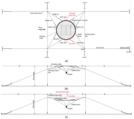 Submersible seaweed platform with concentrated ballast weight: (a) plan view, (b) side view of floating state, (c) side view of submerged state.