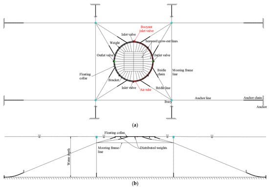 Note that, as the mass density of HDPE is smaller than that of seawater, we need to add ballast weights to the HDPE ring structure so as the structure can be submerged when filled with water. We considered two different ballast weight systems. One system makes use of a concentrated weight attached to the ring structure by lines as shown in Figure 1b,c. The other system makes use of multiple weights that are attached to the HDPE ring structure as shown in Figure 2. In shallower waters, the multiple-weights system allows the ring structure to be submerged closer to the seabed for maximum protection from the strong surface waves in storm events. In the concentrated-weight system, the ring structure can only be submerged to the point where the weight rests on the seabed. For the least amount of line materials, the lines holding the concentrated weight should be 45 degrees with respect to the vertical position (see [] for the proof).