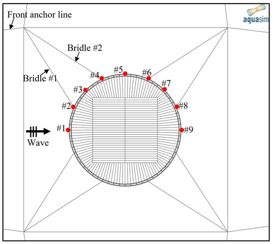 In accordance with the established modelling conventions in fish-cage analysis, the ring structure (comprising two HDPE circular pipes held together by 60 HDPE brackets) is modelled by beam elements, while the mooring lines/chains are modelled by truss elements. The buoys are modelled by spring elements. The spring stiffness is determined from the buoy’s geometry. Furthermore, our modelling framework assumes that the material constitutive relations governing the ring structure and mooring lines obey Hooke’s law. The AquaSim software is used for the hydroelastic analysis. AquaSim makes use of the Finite Element (FE) method and allows for geometric nonlinearities due to large translations and rotations of the flexible ring structure. It considers hydrodynamic (diffraction) forces as well as Morison loads from wave and current. The Morison loads include hydrodynamic forces such as drag force and Froude–Krylov diffraction force and added mass. Therefore, the hydroelastic interactions between the fluid and the flexible structure at the surface state as well as at submerged states at various water depths can be investigated within AquaSim. For the hydroelastic simulations, the drag and mass coefficients are assumed to be 1 and 2, respectively. These values are chosen based on the findings from numerical and experimental studies conducted on HDPE floating fish cages [].