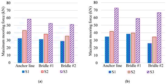 Maximum mooring forces in front anchor line, bridle line #1, and bridle line #2: (a) for concentrated ballast weight, (b) for distributed ballast weights.