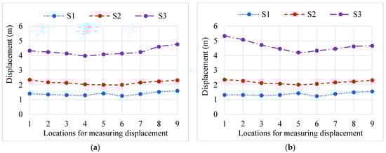 Maximum displacements at various locations of HDPE collar for S1–S3: (a) for concentrated ballast weight, (b) for distributed ballast weights.