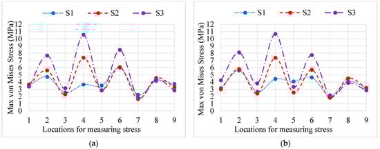 Maximum von Mises stresses at various locations of HDPE collar for S1–S3: (a) for concentrated ballast weight, (b) for distributed ballast weights.